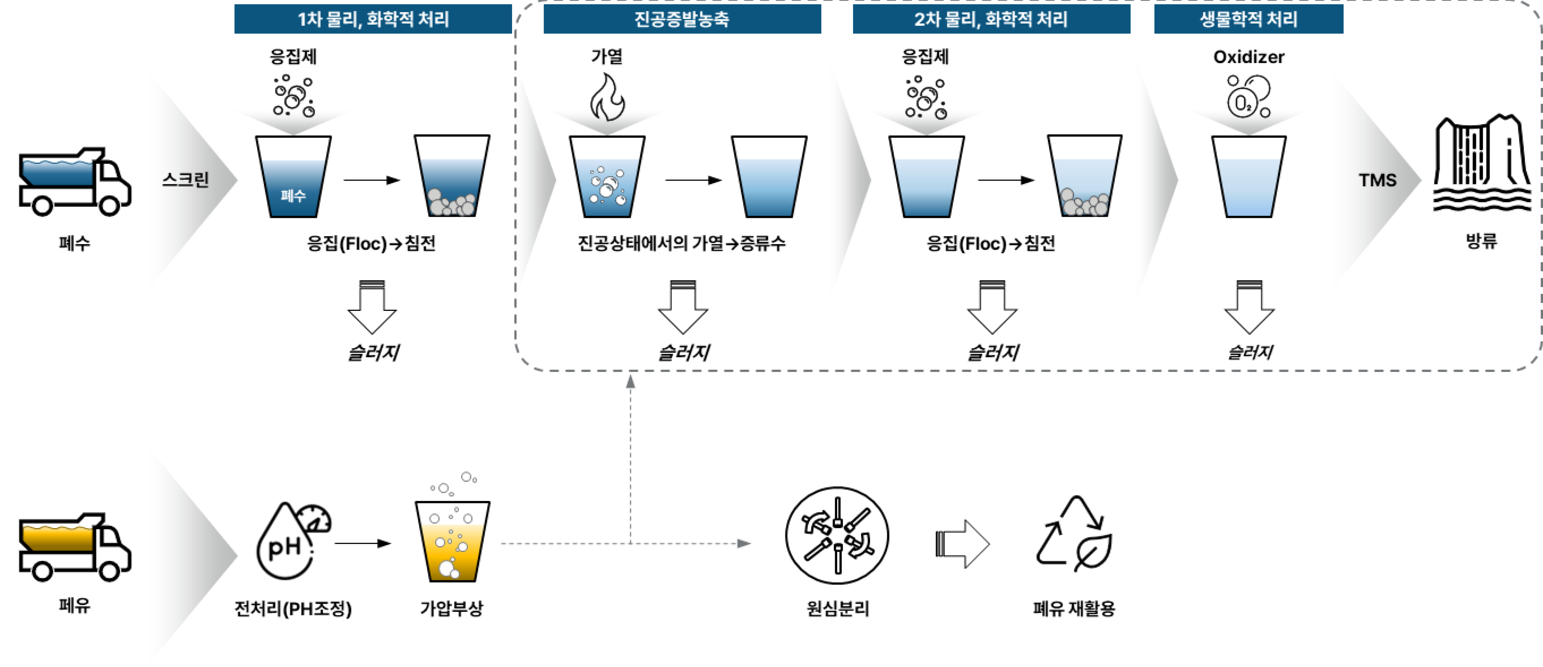 당사는 사업장에서 발생하는 다양하고 광범위한 폐수 및 폐유를 처리함에 있어 무해하고 완벽한 처리시스템(물리, 화학적처리 + 진공증발농축처리 + 생물학적처리시설)을 갖추고 있습니다. 분리된 폐유는 재활용으로 판매하고, 폐수는 자가처리시설로 유입회수 처리하고 있습니다.