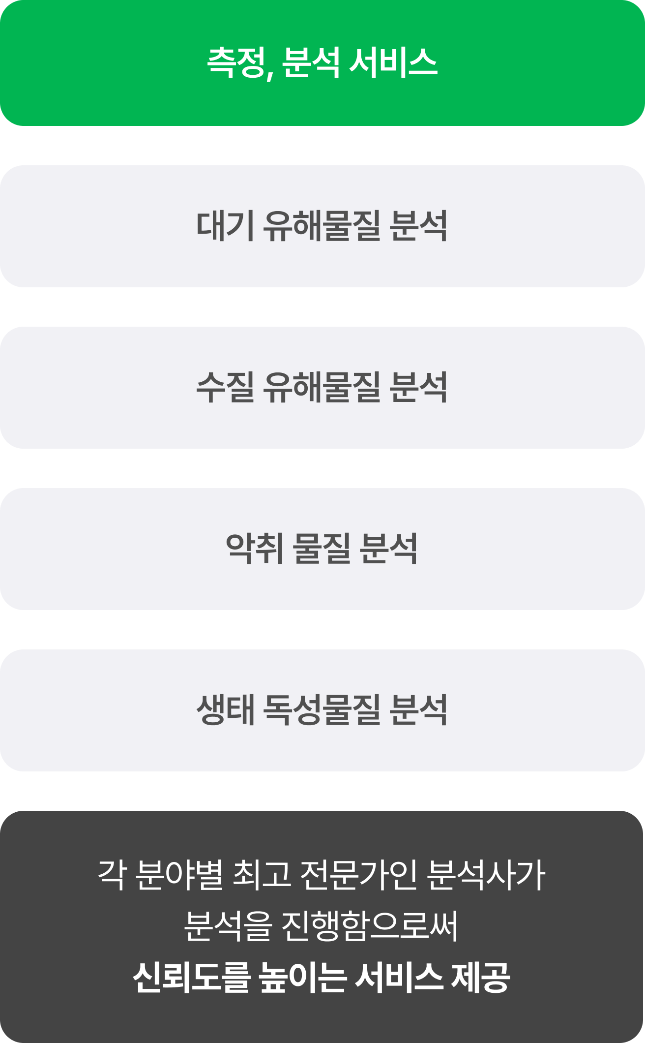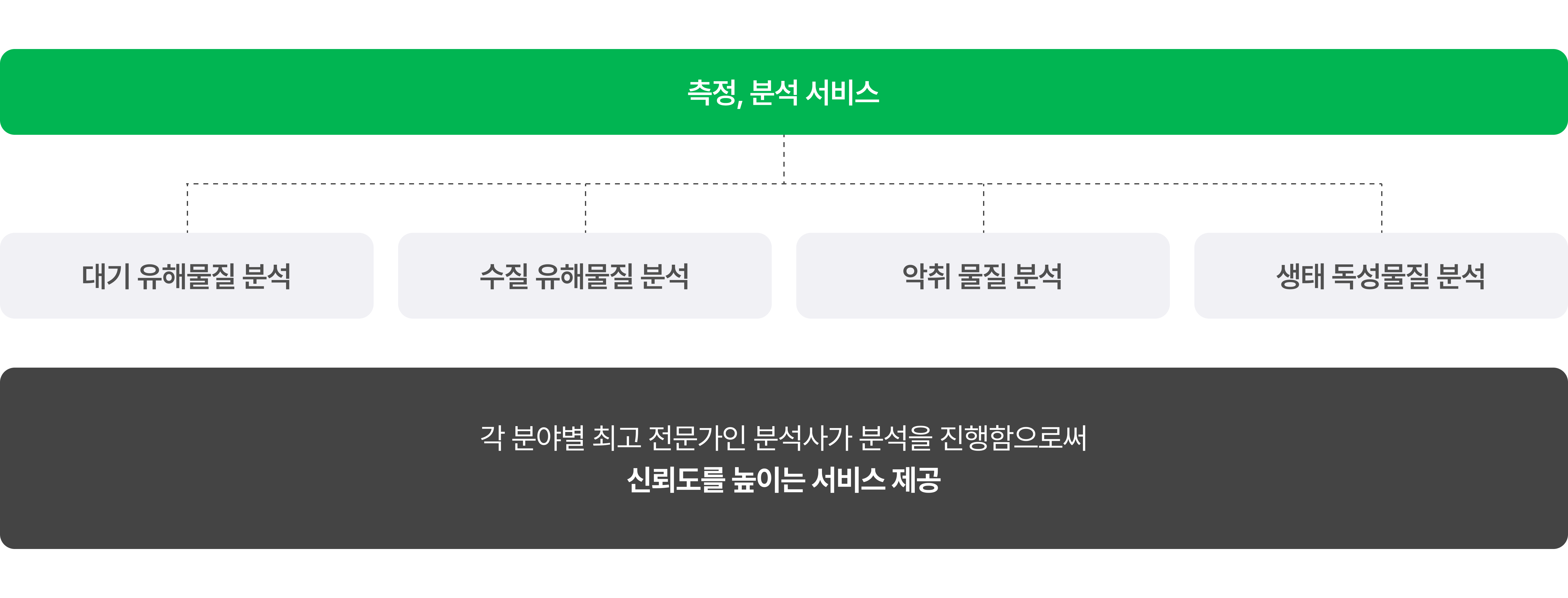 국민들이 보다 나은 쾌적한 환경 속에서 생활할 수 있도록 그 기반이 되는 환경오염정도 확인에 대한 시험분석 서비스를 제공하고 있습니다. 환경측정분석 사업은 ISO17025를 기반으로 시험접수에서부터 완료까지의 전 과정을 관리하고 있으며, 서비스의 품질 관리를 위해 최선의 노력을 다하고 있습니다.